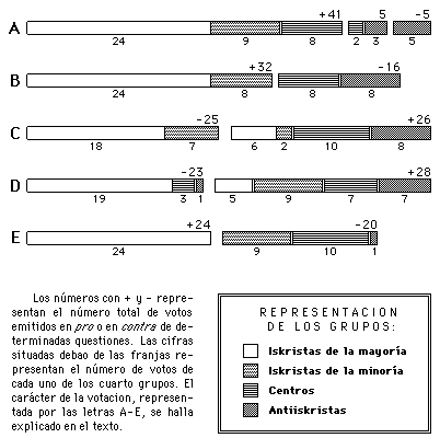 * Esta es precisamente la votación que representa el diagrama B: los iskristas obtuvieron 32 votos y la resolución bundista 16. Es de advertir que no hay entre las votaciones de este tipo ni una sola votación nominal. Tan sólo dos géneros de datos nos indican, con enorme grado de verosimilitud, la distribución de delegados: 1) en los debates, los oradores de los dos grupos de iskristas se declaran a favor, y en contra, los oradores de los antiiskristas y del centro; 2) el número de votos "a favor " se aproxima siempre mucho a 33. Tampoco debemos olvidar que al analizar los debates del Congreso hicimos notar, también fuera de las votaciones, [cont. en pág. 179. -- DJR] toda una serie de casos en que el "centro" se unió a los antiiskristas (a los oportunistas) contra nosotros, como sucedió al tratarse del valor absoluto de las reivindicaciones democráticas, del apoyo a los elementos oposicionistas, de la limitación del centralismo, etc.